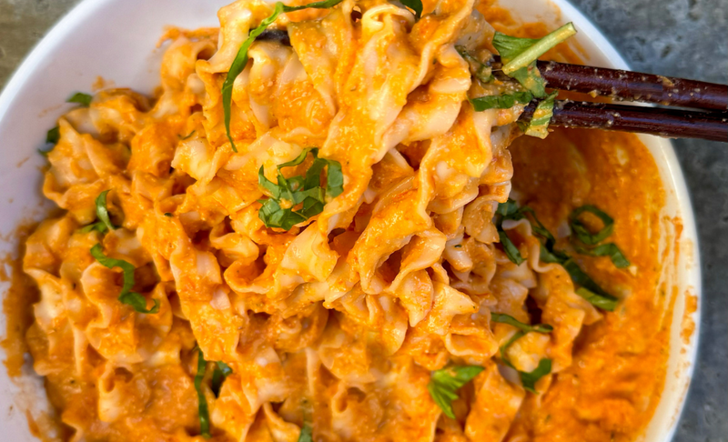 Picture a block of golden brown melty feta surrounded by juicy tomatoes roasted until they are bursting. When blended, it becomes a creamy, sweet and bright sauce. Mix it with our hand cut noodles and you get an easy weeknight dinner!