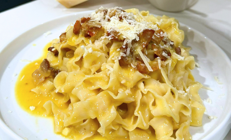 Our kai dong Hand Cut noodles are reminiscent of velvety pappardelle, ideal to be coated in the rich and creamy carbonara sauce. Give this fusion pasta dish a try!