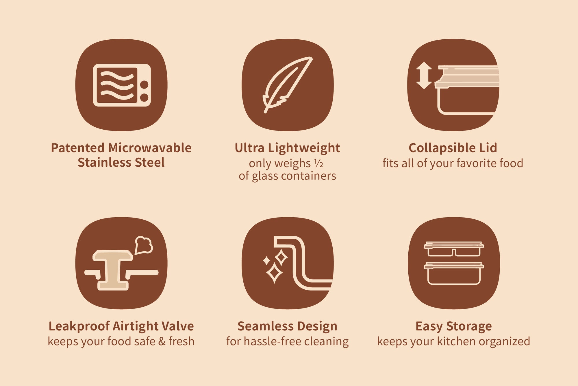 Heat up your meals effortlessly! Our patented stainless steel bento box is designed for safe and easy microwaving. Curious how it works? Check out our FAQs!